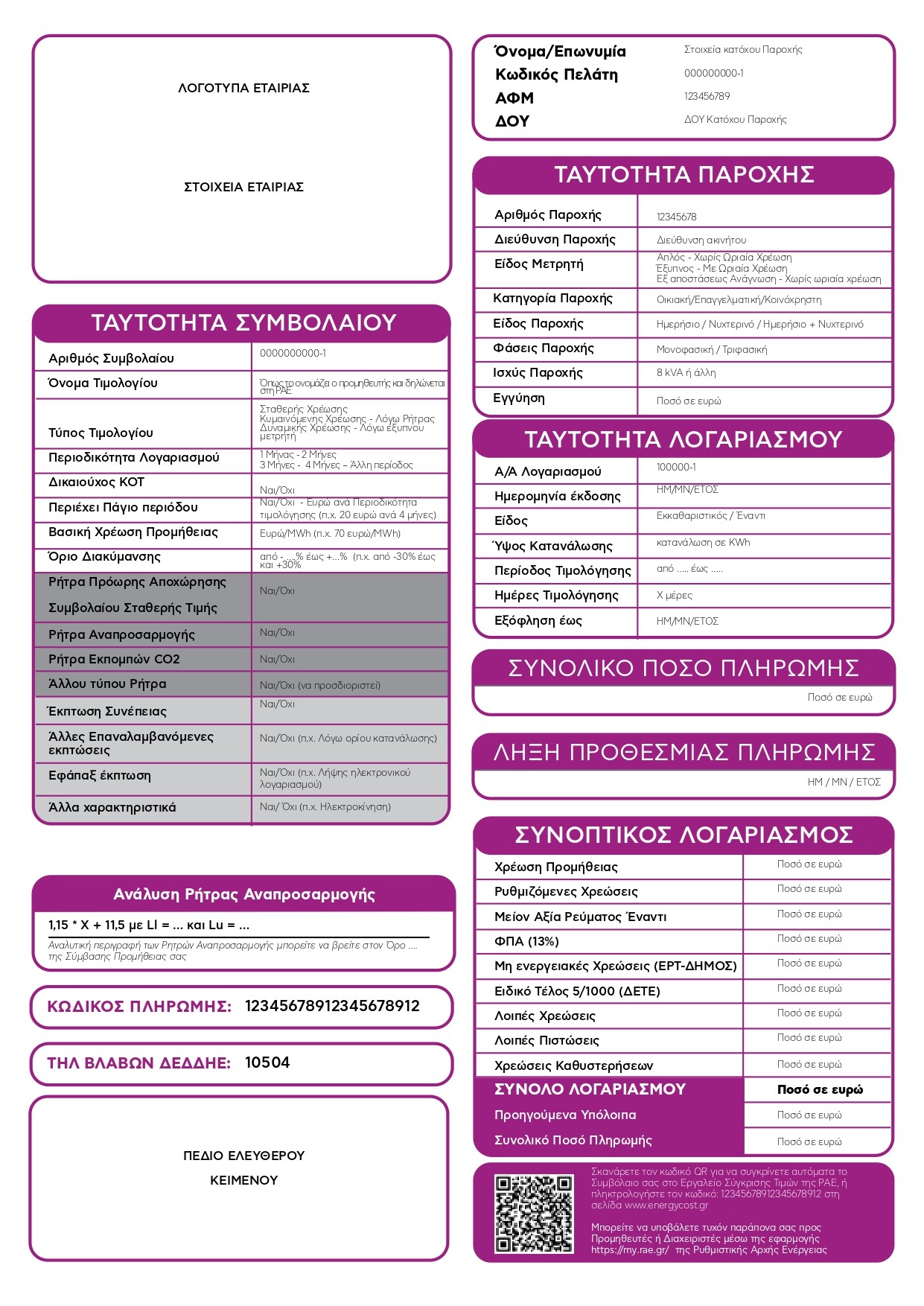 Το πρότυπο λογαριασμού ηλεκτρικής ενέργειας, που εισάγει προς διαβούλευση ο Ρυθμιστής περιλαμβάνει πεδία αναγραφής όλων των χρεώσεων που απαρτίζουν το τελικό ποσό που καλείται κανείς να πληρώσει (energy components).
