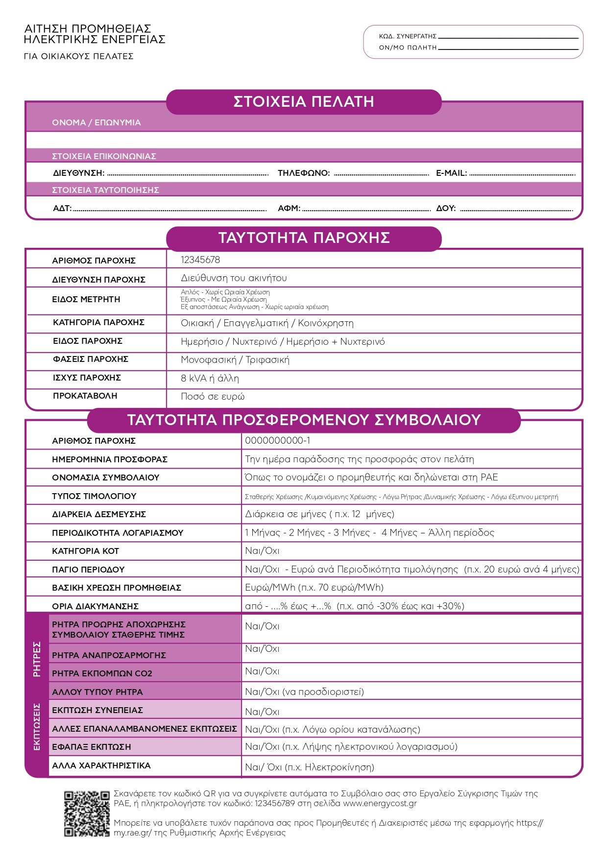 Η ΡΑΕ, «λαμβάνοντας υπόψη τις διατάξεις του κείμενου πλαισίου και την ανάγκη διασφάλισης της πρόσβασης των καταναλωτών σε τυποποιημένα έντυπα, τα οποία να δύνανται να παρέχουν κατά τρόπο σαφή, πλήρη και εύληπτο όλες τις κρίσιμες πληροφορίες που συνδέονται με το εκάστοτε προσφερόμενο προϊόν προμήθειας, διαμόρφωσε το προτεινόμενο υπόδειγμα προσυμβατικής ενημέρωσης».