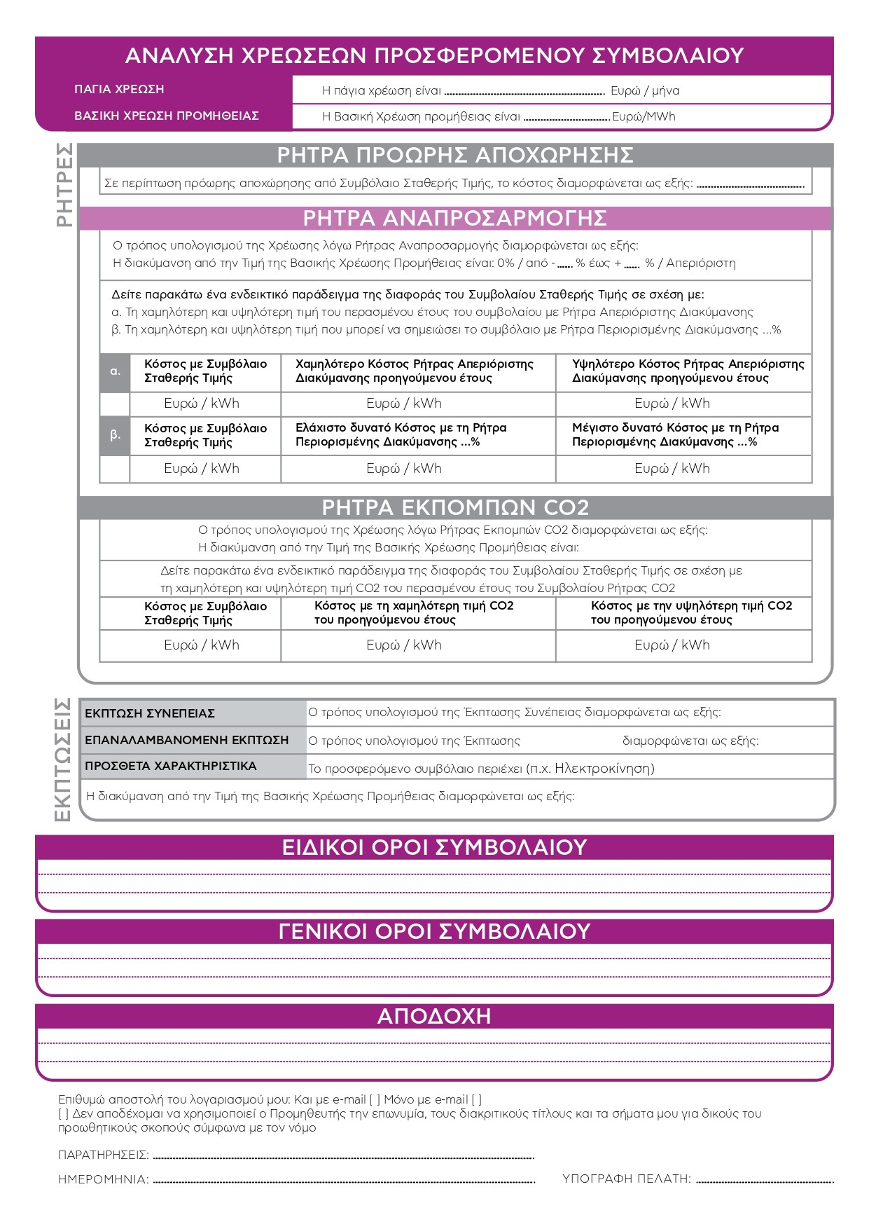 Σε ότι αφορά το τυποποιημένο έντυπο προσφορών, η ΡΑΕ υπενθυμίζει πως κατά το προσυμβατικό στάδιο, προβλέπεται ότι οι Προμηθευτές οφείλουν να τηρούν την αρχή της διαφανούς, ακριβούς και κατανοητής πληροφόρησης κατά την επικοινωνία τους με τους Καταναλωτές και την εν γένει προώθηση των προϊόντων τους. Μάλιστα, ειδικά για τους Μικρούς Πελάτες, προβλέπεται επιπλέον ότι η Προσφορά Προμήθειας περιλαμβάνει «σαφή, εύλογα και διαφανή κριτήρια βάσει των οποίων λαμβάνει χώρα η αναπροσαρμογή των Χρεώσεων Προμήθειας».
